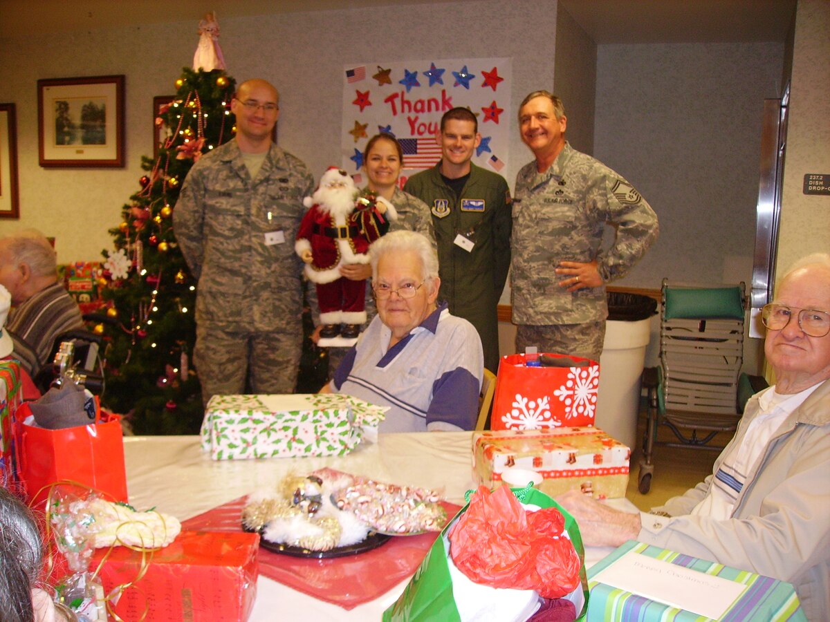 Senior Master Sgt. Tom Lehman, Tech Sgt. Denise Hauser, Staff Sgt. Gary Taiclet, and Senior Airman Doug Evans attend the Christmas Eve Holiday party at the Baldomero Lopez State Veterans' Nursing Home. (U.S. Air Force photo)